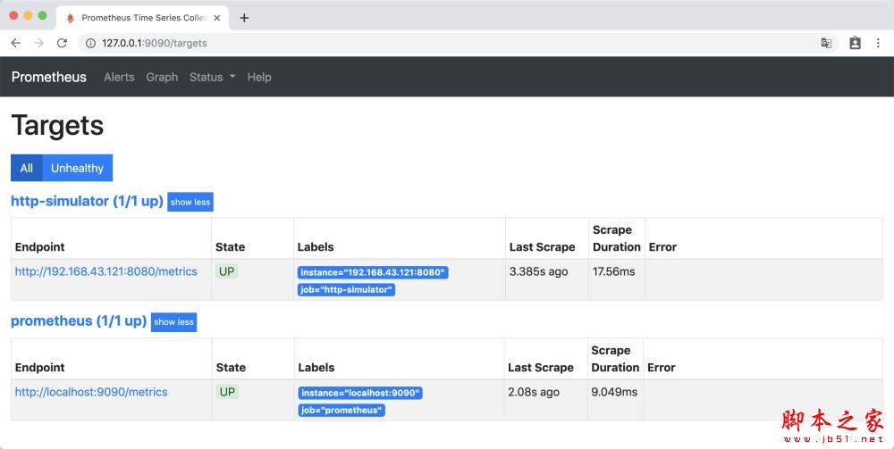 访问http://127.0.0.1:9090/targets ,Prometheus 自身的 metrics 和 http-simulator 的 metrics 处于up 状态 ,那么准备工作就做好了。