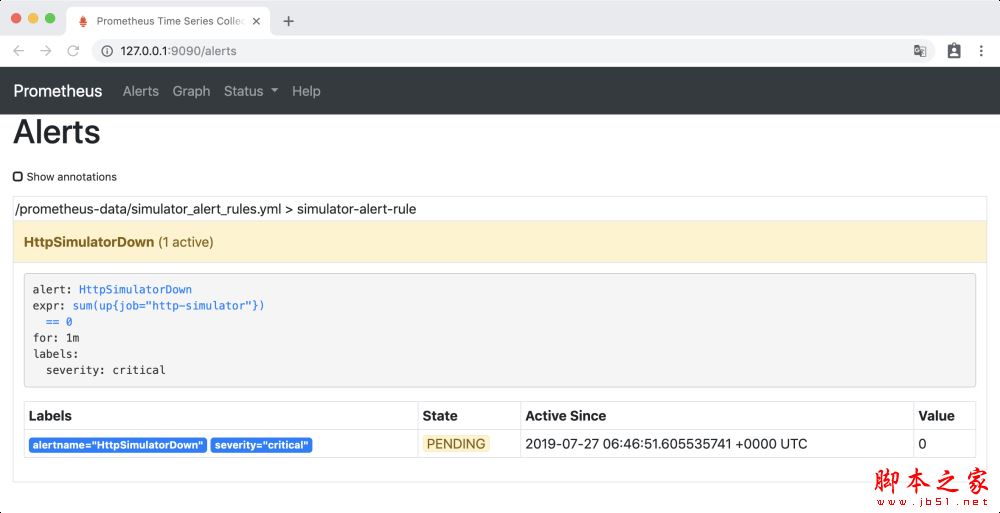 访问http://127.0.0.1:9090/alerts,HttpSimulatorDown 变成黄色,处于 PENDING 状态,表示报警即将被激活。