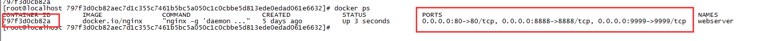 每个容器ID对应一个hash_id,可以看到nginx容器暴露了两个端口。下面我们来添加多一个9999端口。