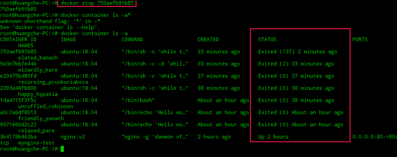 终止状态的容器可以用 docker container ls -a 命令看到。例如: