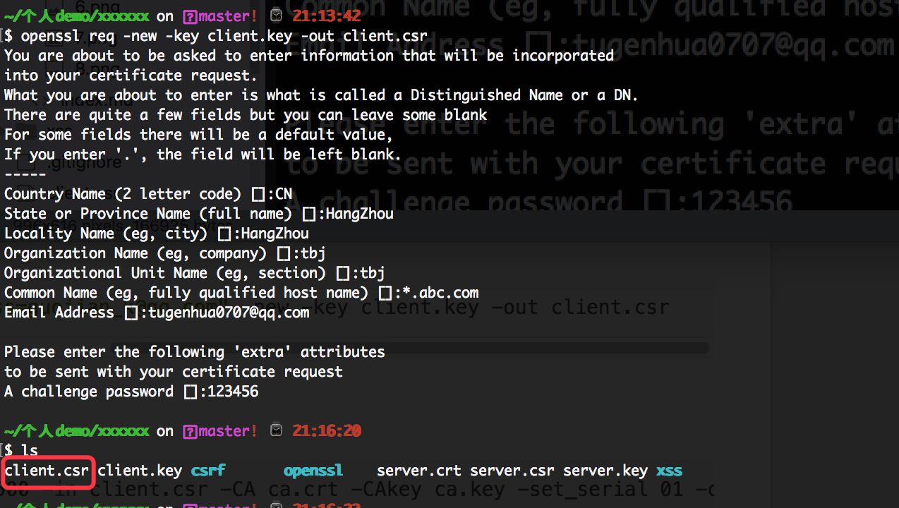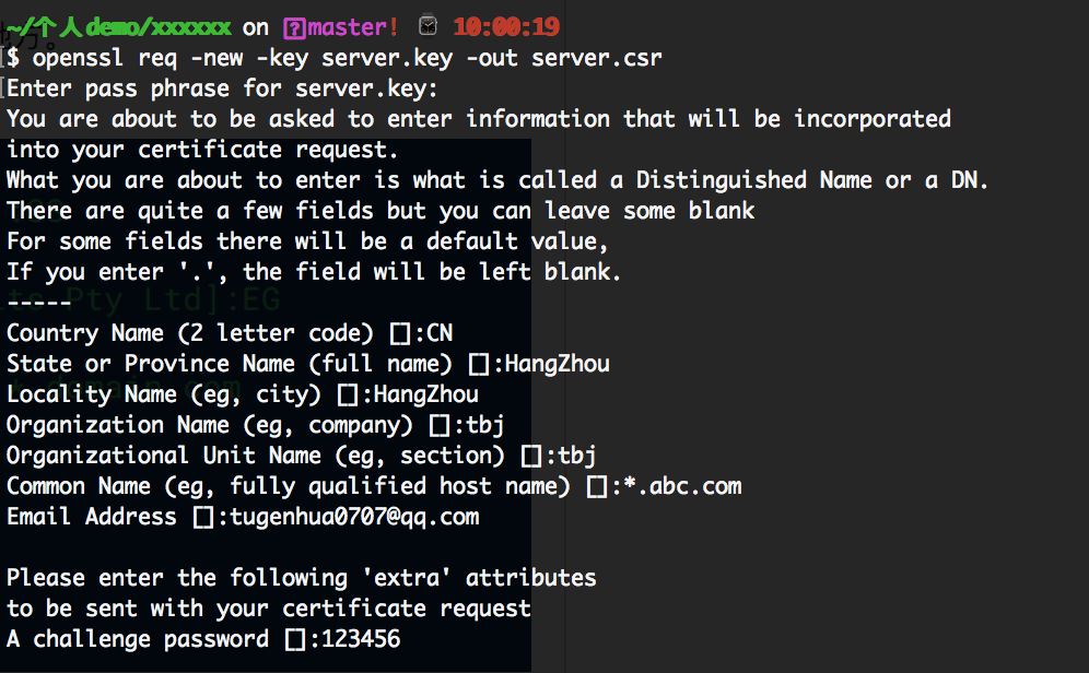 A challenge password []:123456 // 你的证书密码,如果不想设置密码,可以直接回车