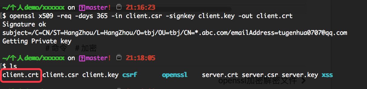 openssl x509 -req -days 365 -in client.csr -signkey client.key -out client.crt