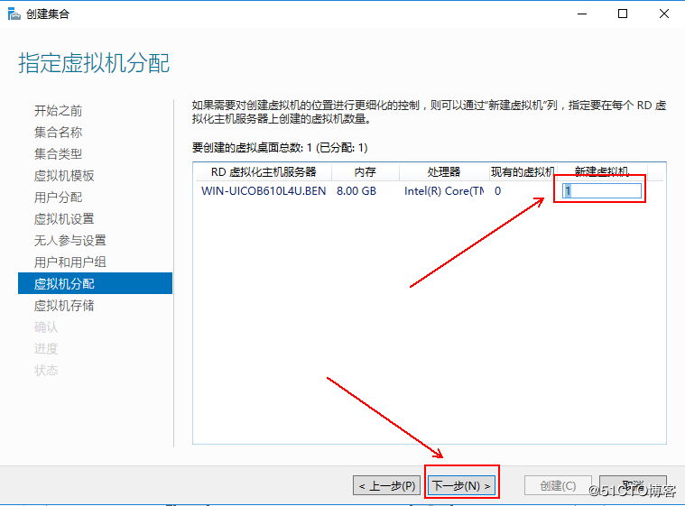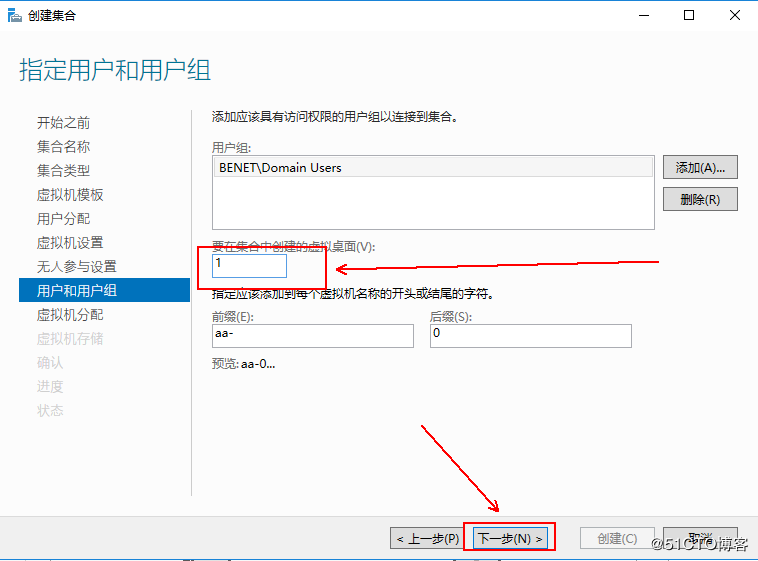 9、这里设置虚拟桌面发布的数量(数量和完成的速度相关,数量越多,部署越慢)和虚拟桌面前缀等信息,设置完成后,单击“下一步”: