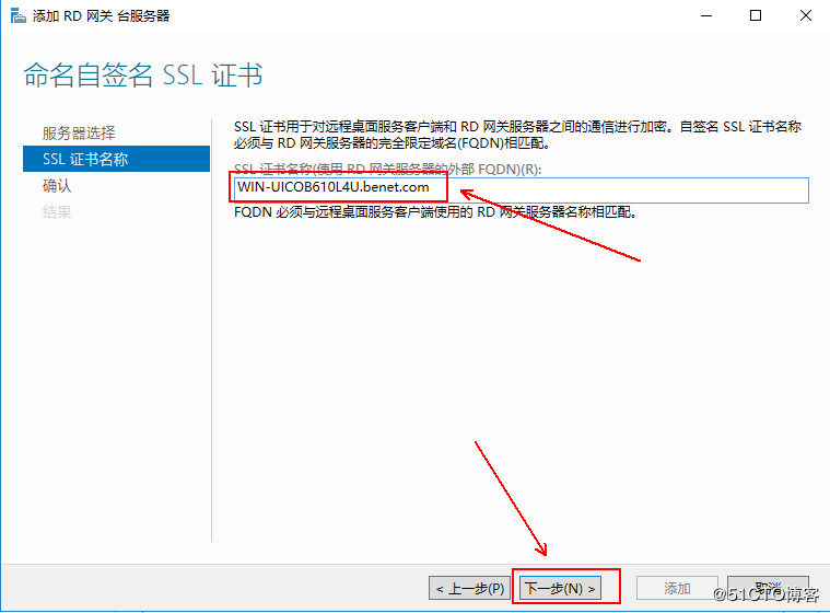 6、这里需要输入的是RD服务器(也就是这个服务器本身)的完全名称,然后单击“下一步,”如下所示:
