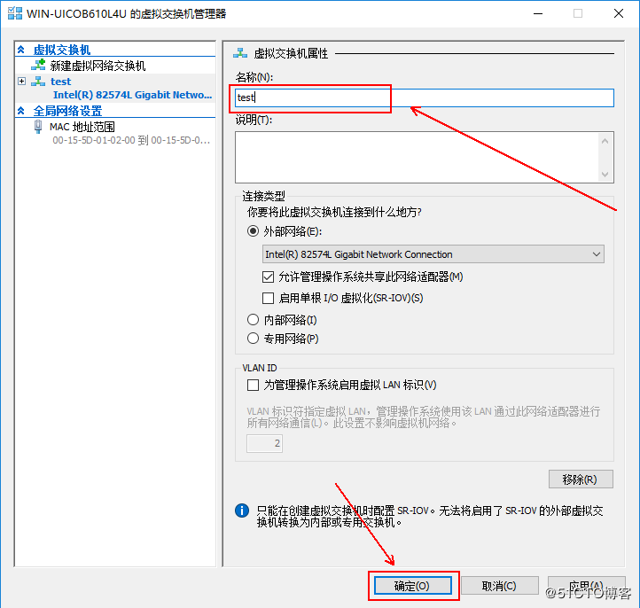 4、设置虚拟交换机的名称,然后单击“确定”: