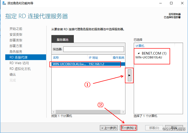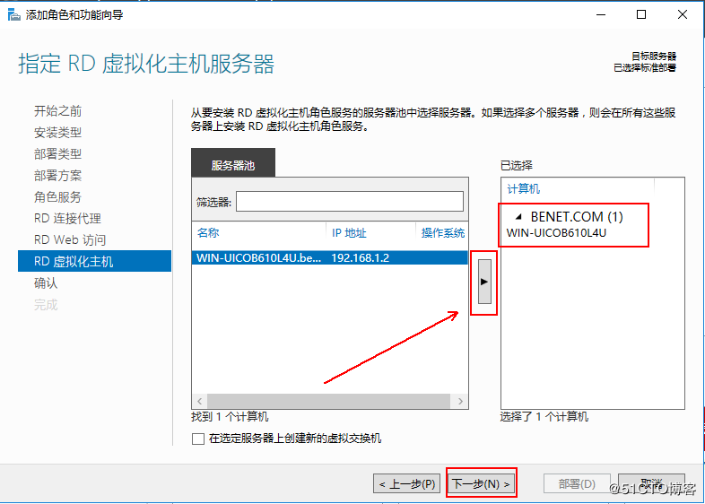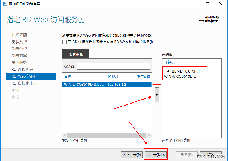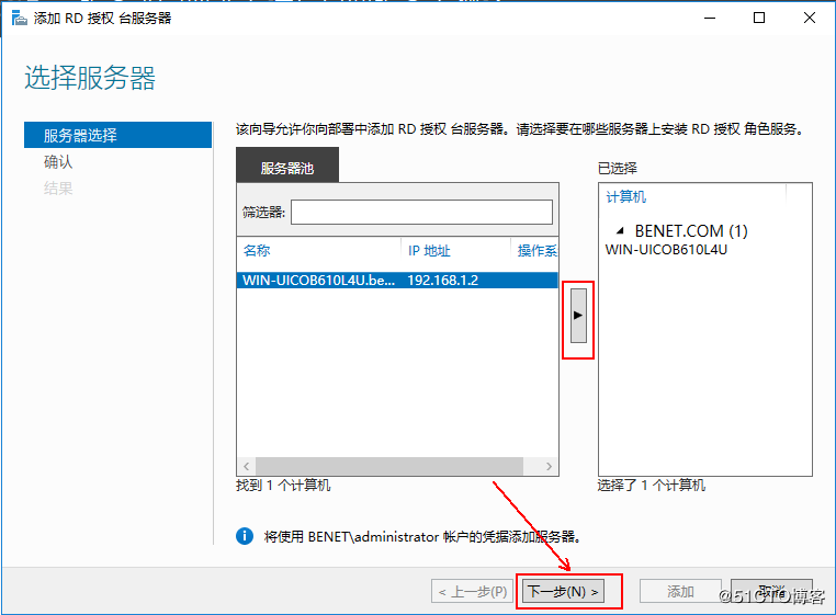 2、在这里把左侧窗格中的服务器添加到右侧窗格,然后单击“下一步”: