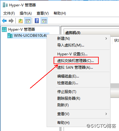 2、右击服务器名称,然后选择“虚拟交换机管理器”选项: