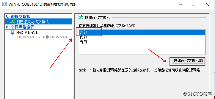 3、选择“外部”,然后单击“创建虚拟交换机”: