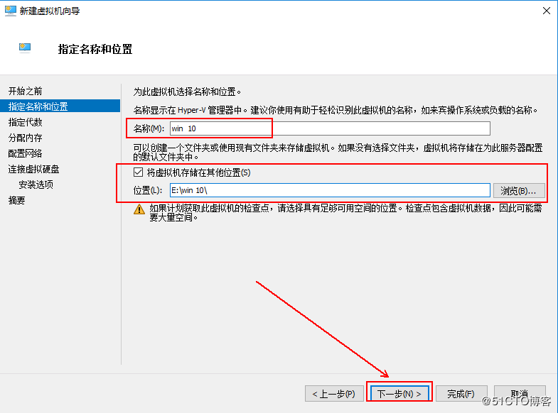 8、在此定义虚拟机的名称和安装位置,然后单击“下一步”: