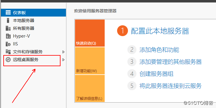 1、在RD服务器上,使用域管理员登录,然后,打开服务器控制台,单击“添加角色和功能”: