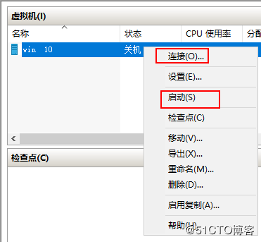 15、现在即可看到创建的虚拟机,右击虚拟机并点击“启动”和“连接”: