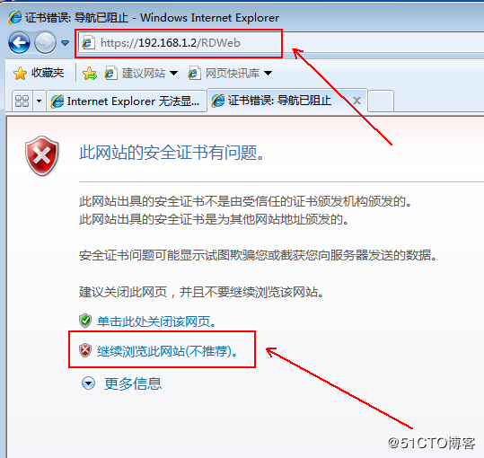 1、在客户端打开浏览器输入:https://192.168.1.2/RDWeb (此ip为RD服务器的ip地址),因为没做CA认证,所以浏览器证书不受信任,单击“继续浏览此网站(不推荐)”即可。便能打开虚拟机登录界面。