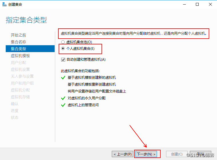 4、在“指定集合类型”如果采用每个用户专有虚拟桌面,可选中“个人虚拟机集合”,然后单击下一步,反之,可选择“虚拟机集合池”,这里可根据实际需求来定义: