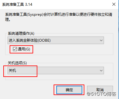 18、在弹出的对话框中,选择“关机”选项,并勾选“通用”复选框,然后单击“确定”(注意,一定要选择为“关机”,要不然,这一步做的没有意义):