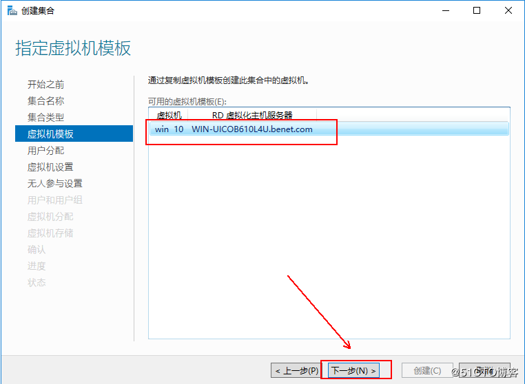 5、在这里指定虚拟机模板,由于这里只做了一个模板,也就是刚刚创建的虚拟机,所以这里只有这一个,可根据实际情况,来选择相应的模板,并单击“下一步”: