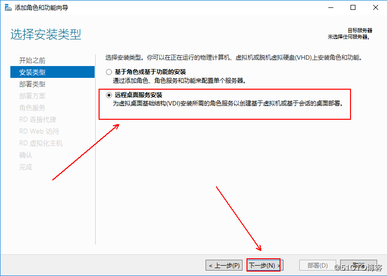 3、选择“远程桌面服务安装”,并单击“下一步”: