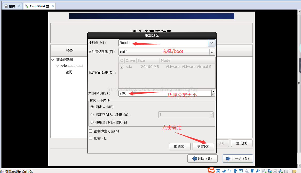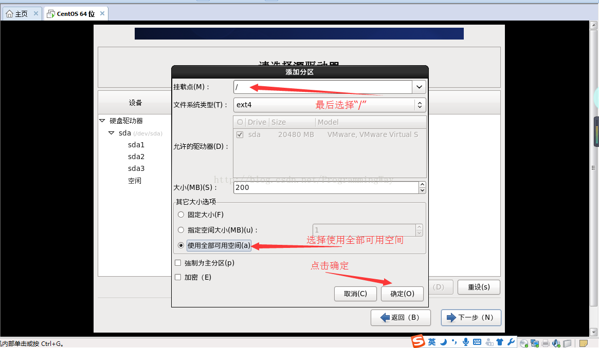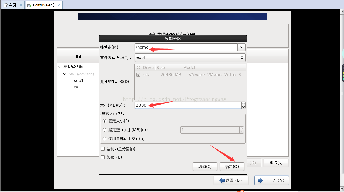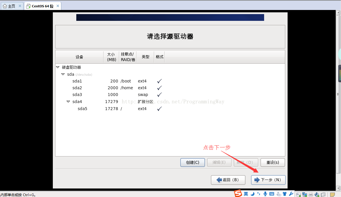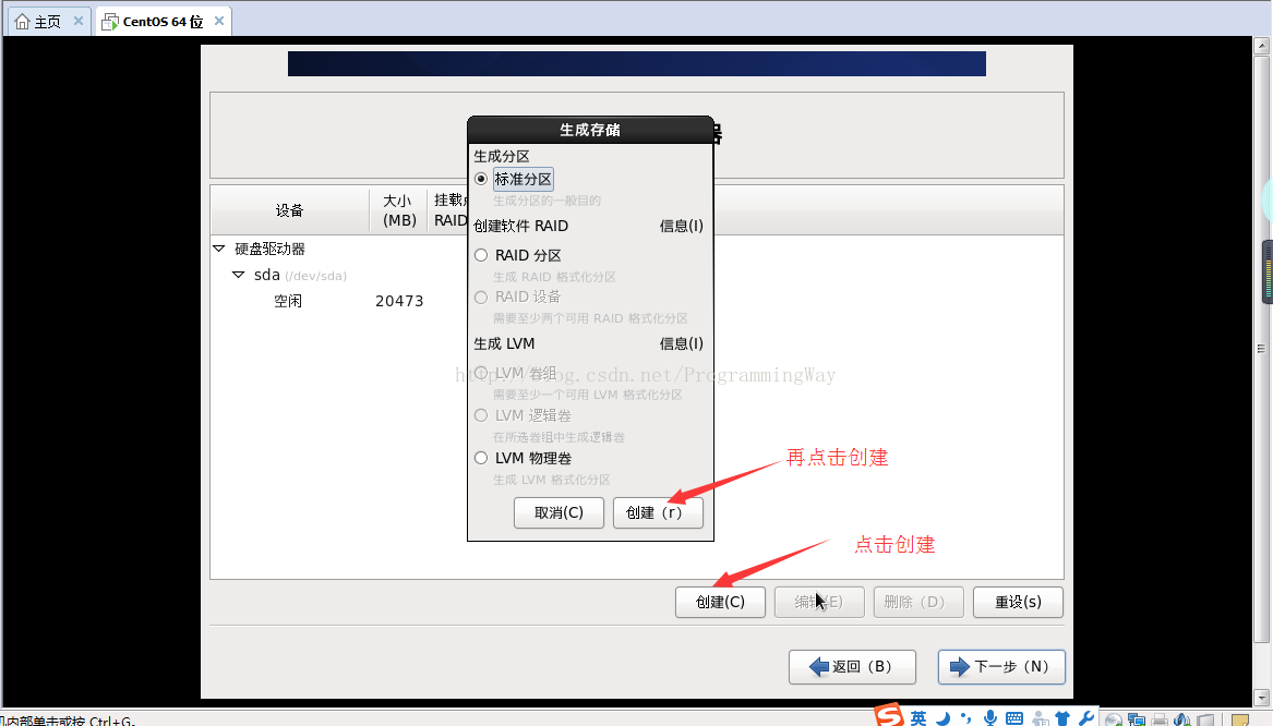 第二十三步:点击创建,给系统分别分"/boot"、"/home"、"swap"、"/"分区;