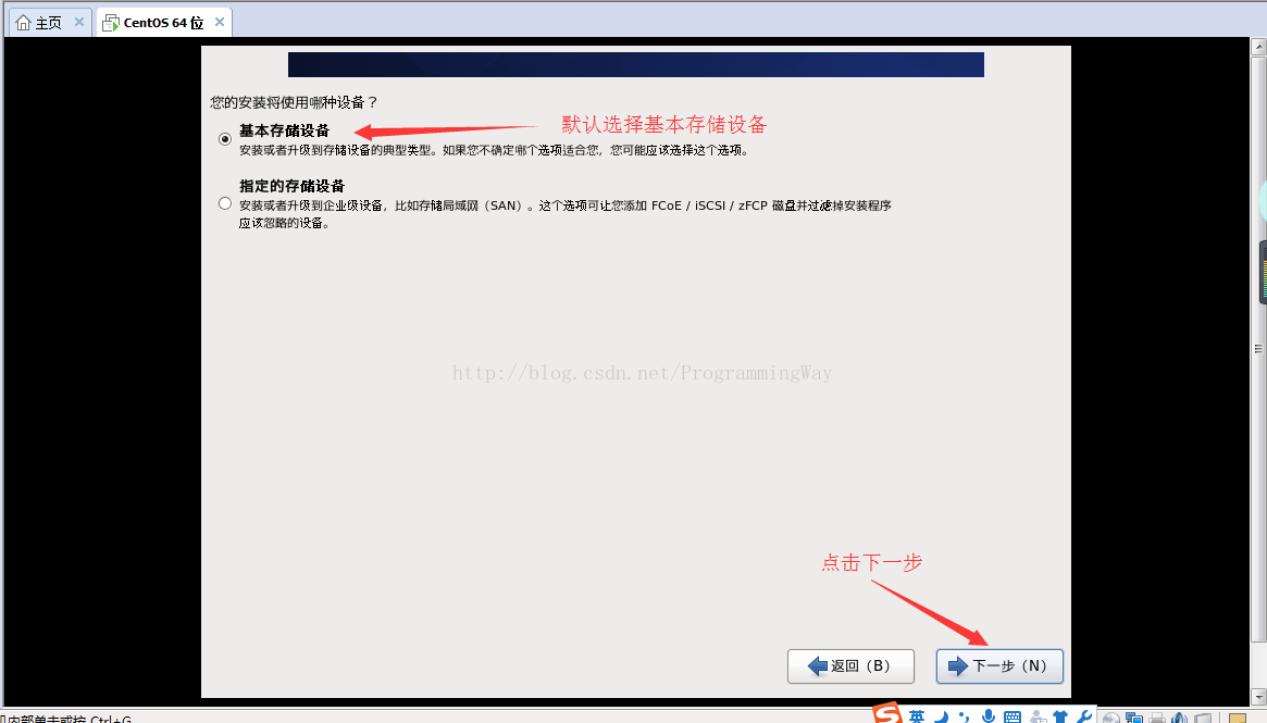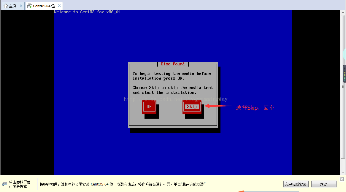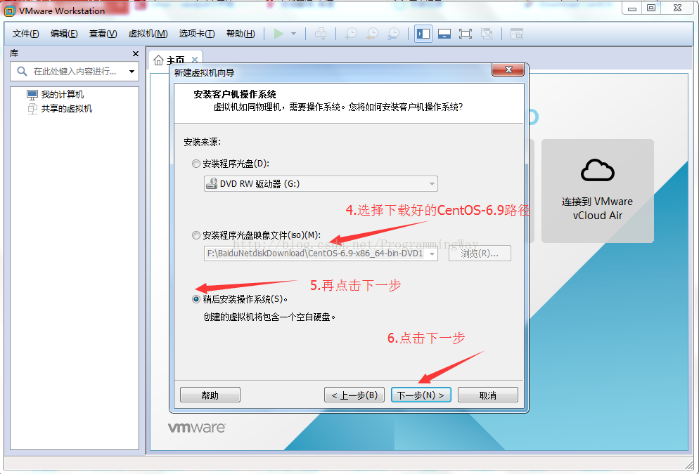 第三步:点击安装程序光盘映像文件-选择下载好的CentOS的iso文件路径,再点击稍后安装操作系统,点击下一步;