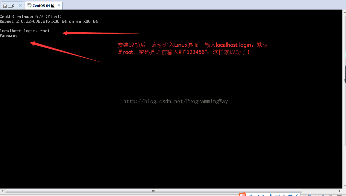 第二十八步:安装成功,启动进入下面的Linux开机界面,输入localhost login:root;密码是之前设置的:123456;到此就完成了。
