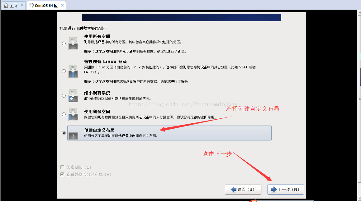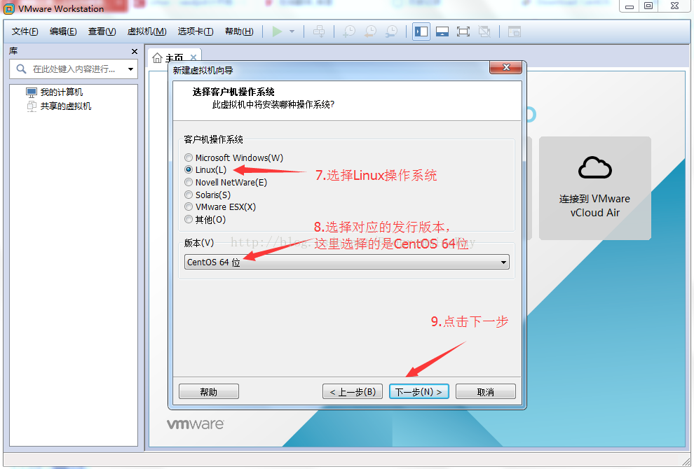 第四步:客户操作系统选择Linux,版本选择对应的版本,这里选择的是CentOS 64位,点击下一步;