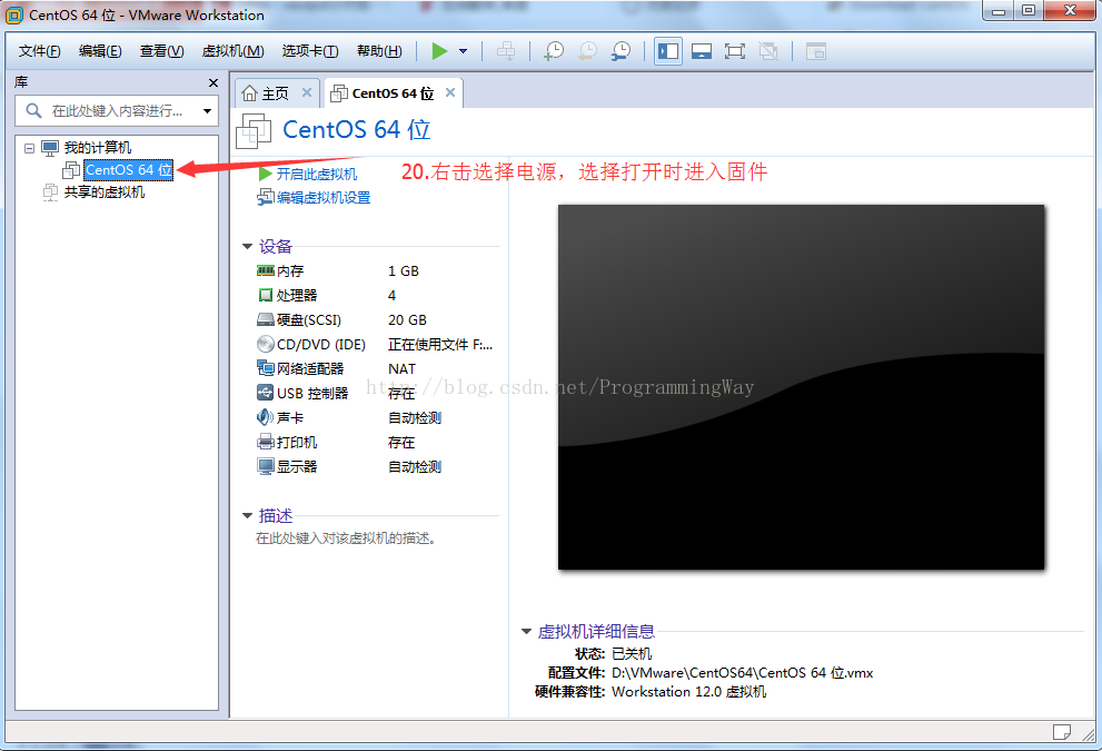 第九步:右击虚拟机CentOS 64位,选择电源——点击打开电源时进入固件;