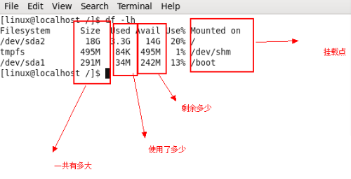 Filesystem指的是系统上的硬件设备文件,Size指的是硬盘或者分区的总大小。Used表示已经使用的大小,Avail表示可以使用的大小。Use%表示已经使用的空间所占的百分比。最后的mounted on表示硬盘挂载到哪个目录下。
