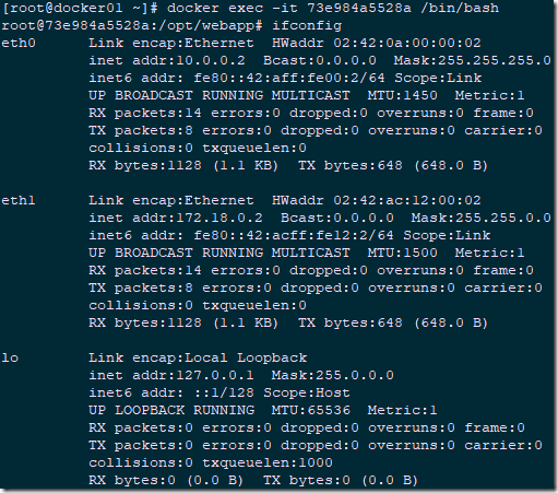 [root@docker02 ~]# docker exec -it 89eac9521743 /bin/bash root@89eac9521743:/opt/webapp# ifconfig