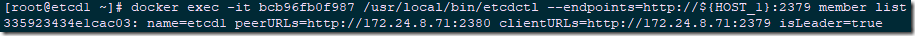 [root@etcd1 ~]# docker exec -it bcb96fb0f987 /usr/local/bin/etcdctl --endpoints=http://${HOST_1}:2379 member list