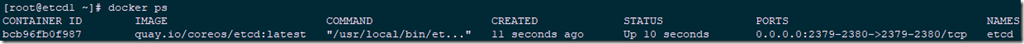 [root@etcd1 ~]# docker run \ -p 2379:2379 \ -p 2380:2380 \ --volume=${DATA_DIR}:/etcd-data \ --name etcd ${REGISTRY}:${ETCD_VERSION} \ /usr/local/bin/etcd \ --data-dir=/etcd-data --name ${NAME_1} \ --initial-advertise-peer-urls http://${HOST_1}:2380 --listen-peer-urls http://0.0.0.0:2380 \ --advertise-client-urls http://${HOST_1}:2379 --listen-client-urls http://0.0.0.0:2379 \ --initial-cluster ${NAME_1}=http://${HOST_1}:2380