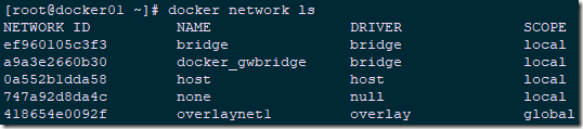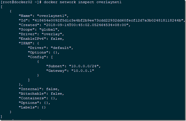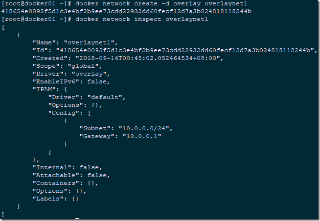 [root@docker01 ~]# docker network create -d overlay overlaynet1 418654e0092f5d1c3e4bf2b9ee73cdd22932dd60fecf12d7a3b024818118244b [root@docker01 ~]# docker network inspect overlaynet1