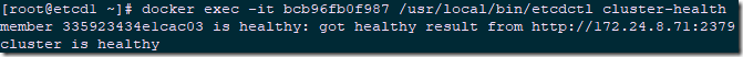 [root@etcd1 ~]# docker exec -it bcb96fb0f987 /usr/local/bin/etcdctl cluster-health