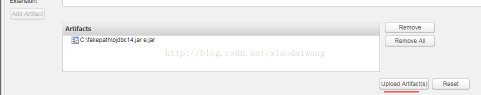 5.将以上参数填完之后,选择要上传的jar包,点击”add artifact“,最后点击”save“保存按钮即可,如下图所示: