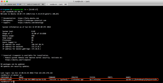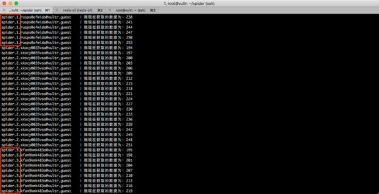 此时,再一次查看爬虫的运行情况,可以发现三台机器上面会各自运行一个容器。如下图所示。