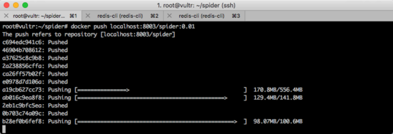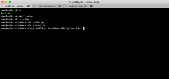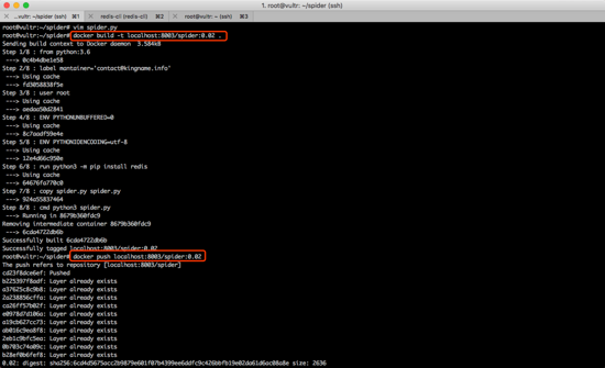 这里需要特别注意,由于我们要把这个镜像上传到私有源供Slave服务器上面的从节点下载,所以镜像的命名方式需要满足 localhost:8003/自定义名字:版本号 这样的格式。其中的 自定义名字 和 版本号 可以根据实际情况进行修改。在本文的例子中,我由于要模拟一个爬虫的程序,所以给它取名为spider,由于是第1次构建,所以版本号用的是0.01。
