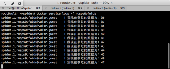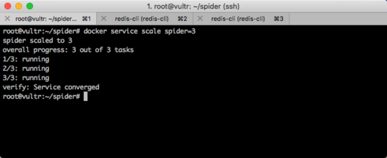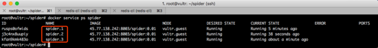 这个命令创建了一个名为 spider 的服务。默认运行1个容器。运行情况如下图所示。