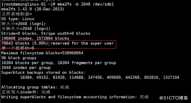 mke2fs -m 0.1 /dev/sdb1 设置预留空间为0.1%