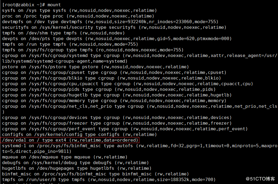 mount 查看 /dev/vda1 on / type ext4 (rw,relatime,data=ordered)