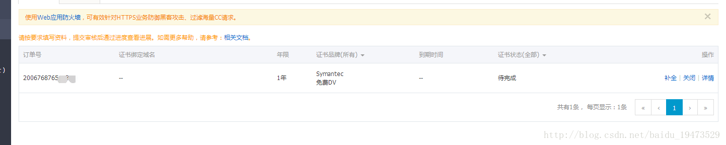 此时还未完成,需要点击补全信息,并填写相应信息。真实填写就可以了。包括:域名、姓名、邮箱等等。因为我的域名是托管到阿里云解析服务的,所以我的认证方式DNS解析认证,并勾选了发送cname。填写完成后才是“待审核”状态,等待就可以了。