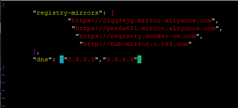 接下来,需要在/etc/docker/daemon.json中添加dns