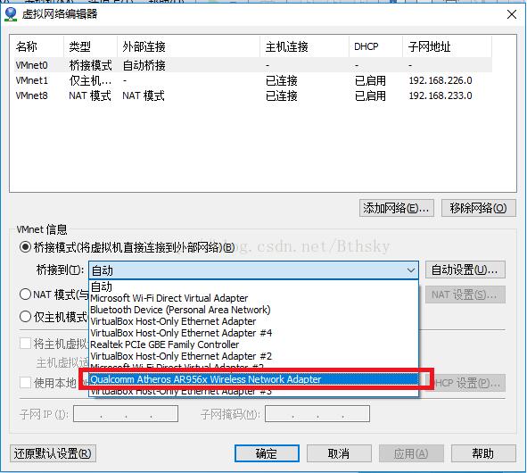 3.将VMnet0(或其它类型为桥接模式的网络适配器)桥接的网卡由默认的“自动”改为连上互联网的网卡(如图)。