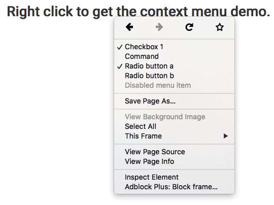 在 HTML 5.1 中, 你可以使用 <menu> 标记来定义菜单,里面包含了一个或者多个 <menuitem> 元素, 然后利用 contextmenu 属性将其绑定到任何元素上。 <menu> 元素的 id 取值应该与我们想要为其添加上下文菜单的元素的 contextmenu 属性取值保持一致。