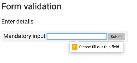 新的 reportValidity() 方法允许你校验一个表单和重置结果,并且在浏览器适合位置向用户报告错误。用户代理可以报告一个以上的限制规则,假如单一元素同时遇到多个问题。对于这种情况,“密码”输入为必填内容但没有填,将会标识为错误。