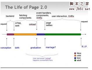 以上是一张web2.0页面的生命周期图。工程师很形象地讲它分成了“怀孕,出生,毕业,结婚”四个阶段。如果在我们点击网页链接的时候能够意识到这个过程而不是简单的请求-响应的话,我们便可以挖掘出很多细节上可以提升性能的东西。今天听了淘宝小马哥的一个对yahoo开发团队对web性能研究的一个讲座,感觉收获很大,想在blog上做个分享。