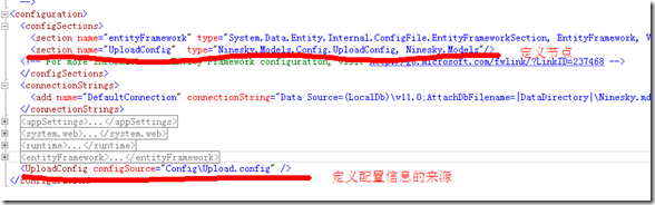 3、自定义节,表示自定义的一个节点。section name="UploadConfig" type="Ninesky.Models.Config.UploadConfig, Ninesky.Models"/>