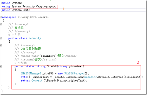 引用System.Security.Cryptography命名空间(1),并实现SHA256静态加密方法。