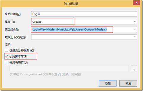 模板选Create,模型类选LoginViewModel ,选项选中引用脚本库。完成后代码