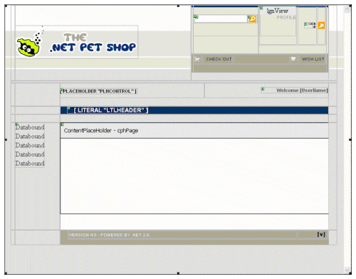 在PetShop 4.0中,建立了名为MasterPage.master的Master Page,它包含了header、LoginView控件、导航菜单以及用于呈现内容的html元素,如图6-3所示:
