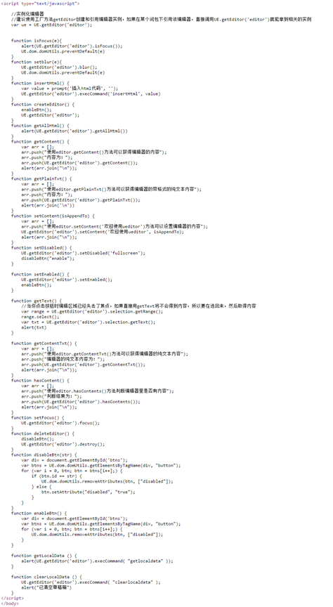 添加zh-cn.js文件是要设置语言,防止自动识别语言错误而导致语言适配错误,UEditorHelper.js文件是一些常用的方法和编辑器设置的封装,查看index.html的源代码,在其中有一段js代码