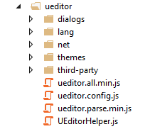 index.html 是一个示例文件、可以删去,ueditor.config.js中是一些富文本编辑器的设置,建议不要改动,可以在页面中引用的时候设置,如果所有页面都需要设置可以写在一个js文件中,dialogs是在文本框中点击按钮时用到的一些弹出框效果,lang文件夹下是语言相关的设置,目前只有中文与英文,themes文件夹下是一些样式,third-party文件夹下是一些第三方的插件,有代码高亮,截屏等