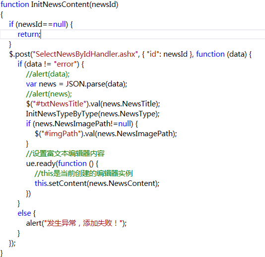 首先在页面加载时获取到新闻的id,然后再进行ajax查询,查询新闻封装在了一个handler中,向这个handler发起ajax请求,请求参数为新闻id,获取新闻,获取到之后,把新闻的内容设置给ueditor